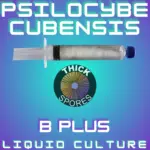 B Plus liquid culture syringe specimens were developed by a cultivator known as Mr. G in the 1990s. Its exact genetic origins are debated, with some suggesting it may be a hybrid between P. cubensis and P. azurescens, though this remains unproven.